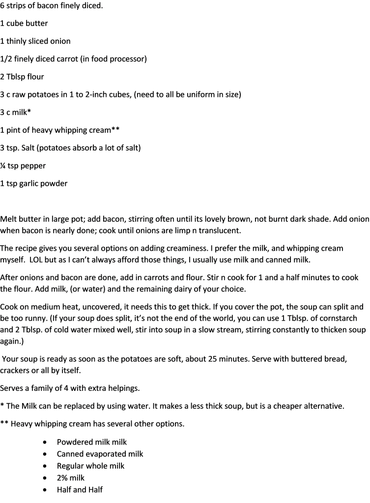 It has been a rough weather week across the country this week with many storms. I have made mostly soups and stews this week. My granddaughter asked me to put in her favorite soup for you this week. Potato soup. It is a simple tasty soup, that has several ways to make it, if you read in the bottom of the recipe you will find several variations on the ingredients. However this will be the version given with what I consider to be the most flavorful. I totally understand if you can’t afford some of the ingredients, however, there are substitutions listed in the bottom of the recipe.